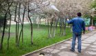 Деревья, пораженные горностаевой молью и окутанные белой паутиной, поливали под сильным напором обыкновенной водой накануне на территории детского ...