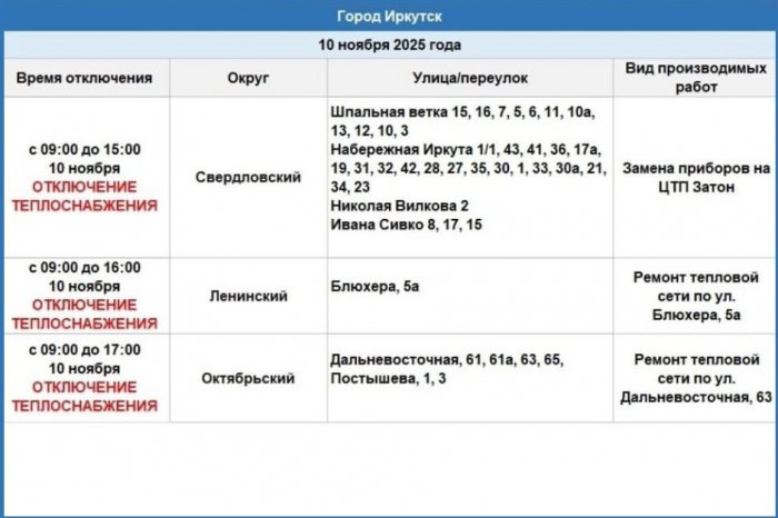 10 ноября некоторые дома в Ленинском, Октябрьском и Свердловском округах Иркутска будут отключены от теплоснабжения. Специалисты проведут ремонтные работы на тепловых сетях, чтобы предотвратить возможные аварии.