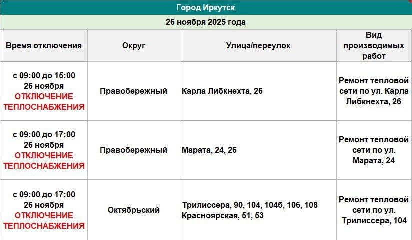 Сегодня, 26 ноября, в некоторых домах Правобережного и Октябрьского районов будет ограничено теплоснабжение для проведения ремонтных работ на тепловой сети.