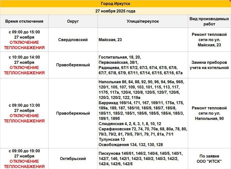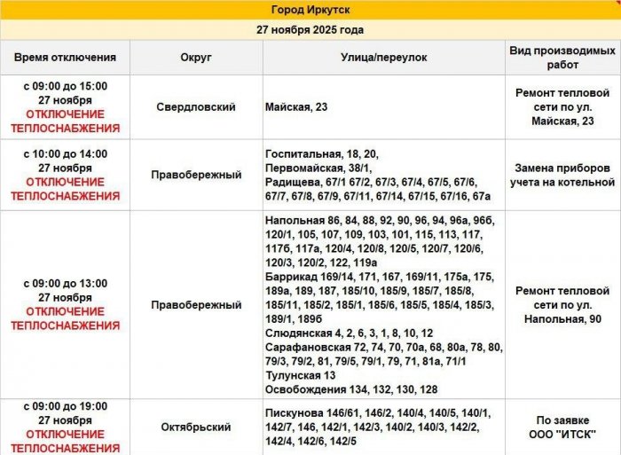 Сегодня, 27 ноября, в некоторых домах Правобережного, Свердловского и Октябрьского округов будет ограничено теплоснабжение для проведения ремонтных работ на тепловой сети.