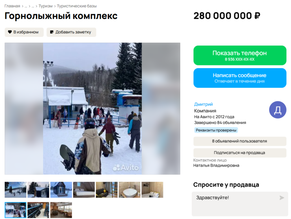 В объявление включено все оборудование: подъемники, техника для подготовки трасс, снегоходы. Комплекс также включает модульные гостевые дома и два кафе.