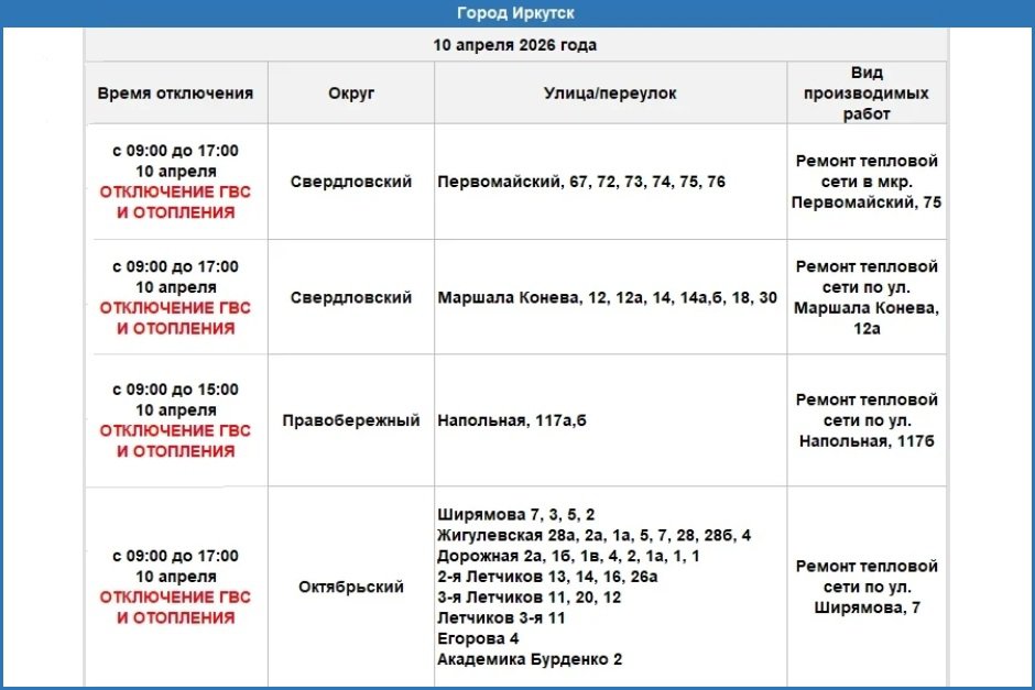 Сегодня, 10 апреля, в ряде домов Свердловского, Правобережного и Октябрьского округов Иркутска будет временно прекращено горячее водоснабжение. Это связано с проведением ремонтных работ и диагностики теплосетей.