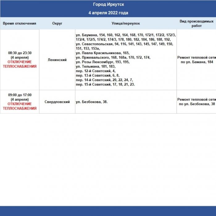 4 апреля в некоторых домах Ленинского и Свердловского районах будет отключено отопление