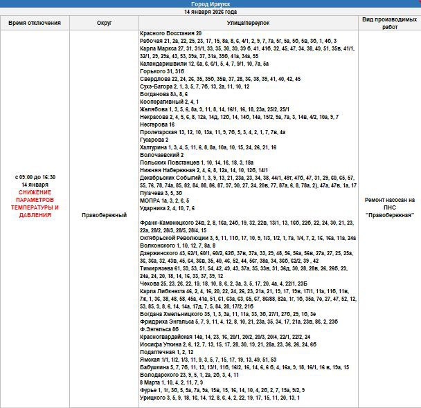 Сегодня, 14 января, в некоторых домах Правобережного и Свердловского округов Иркутска будет ограничено теплоснабжение для проведения ремонтных работ на тепловой сети.